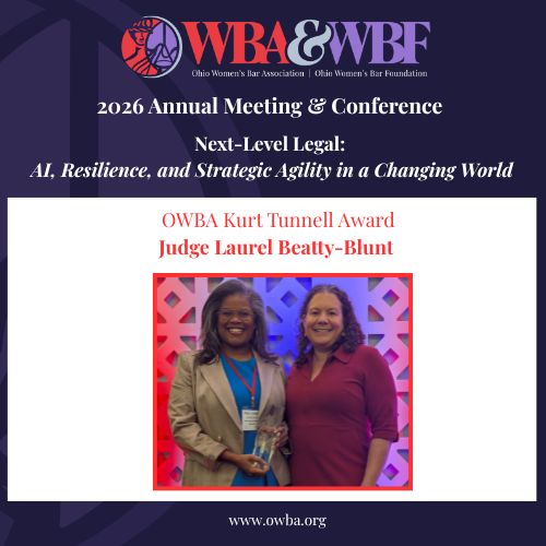 2016 | Anthony Sharett, Partner, Baker & Hostetler LLP 2017 | James (Jim) Johnson, Founder, Summer Work Experience in Law 2018 | Kurt Tunnell, Bricker & Eckler 2019 | Bill Nolan, Barnes & Thornburg 2021 | Kimberly Amrine, Frost Brown Todd 2022 | Jeffrey B. Jones, Littler Mendelson 2023 | Marilyn McClure Demers, Nationwide 2024 | Lindsay Karas Stencel, Thompson Hines 2025 | Trischa Snyder Chapman, BakerHostetler LLP 2026| Judge Laurel Beatty-Blunt, 10th District Court of Appeals