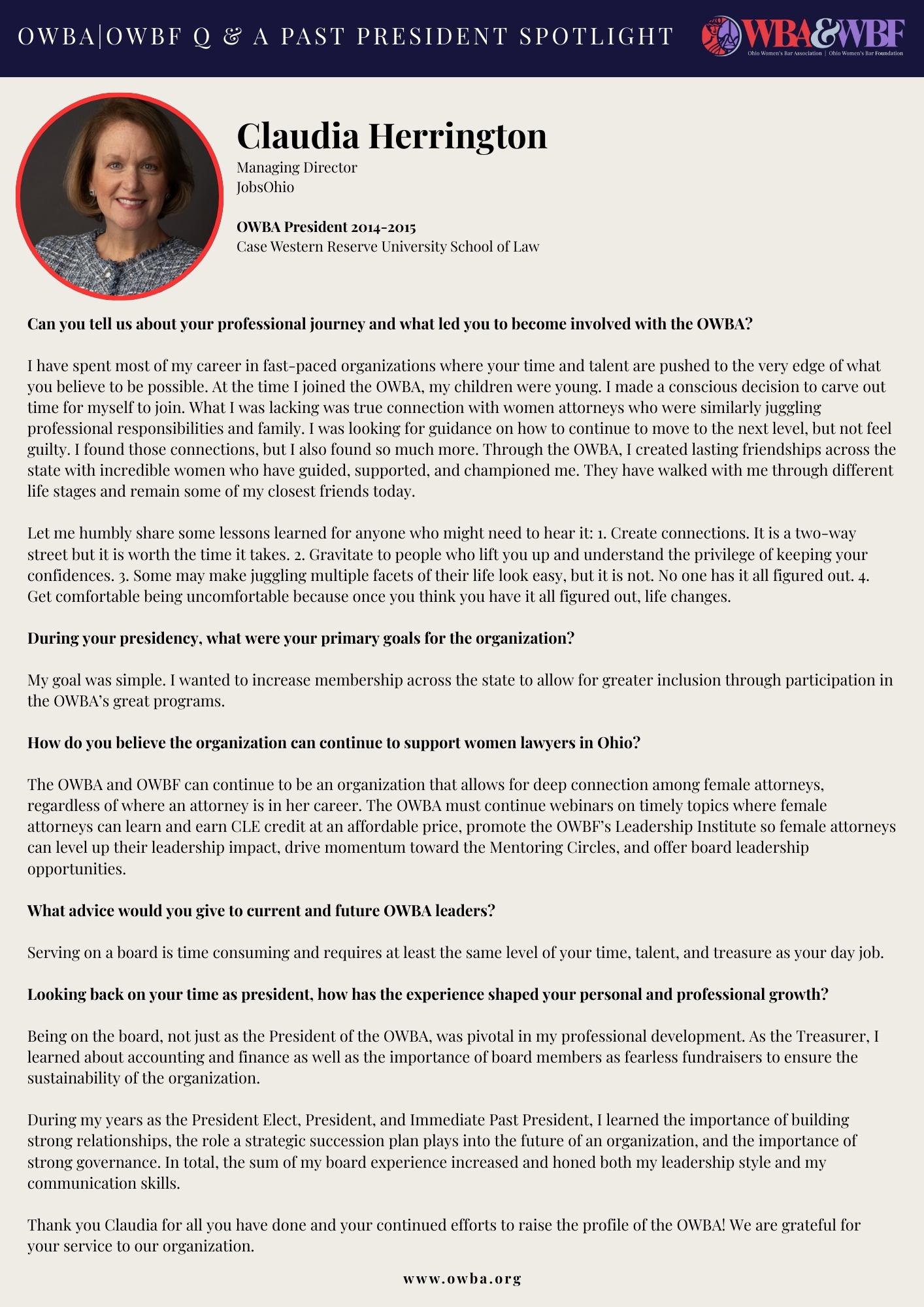 Every Month we will highlight a past president, this month we are highlighting Claudia Herrington!
